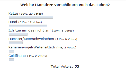 Die meisten Freunde genießt im Bohneland die Katze mit 36 %. An Nr. 2 reiht sich der Hund mit 31 %. 15 % sind völlige Tierverweigerer. 11 % teilen mit Hamster oder Meerschweinchen das Heim; 4 % mit Kanarienvogel oder Wellensittich. 2 % erfreuen sich an Goldfischen…