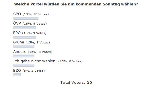 18 % würden demnach für die SPÖ voten, sie wären damit die Stimmensstärksten. Jeweils 16 % möchten ihre Stimme für die ÖVP bzw. die FPÖ abgeben. So ein Ergebnis ist schwierig zu interpretieren, gibt eine gewisse Pattsituation wieder. Das Pendel kann schnell sowohl für die eine wie die andere Partei stärker ausschlagen. Auch die Grünen liegen mit 15 % nur knapp dahinter und sind damit im Rennen. Abgeschlagen nur das BZÖ mit 5 %…